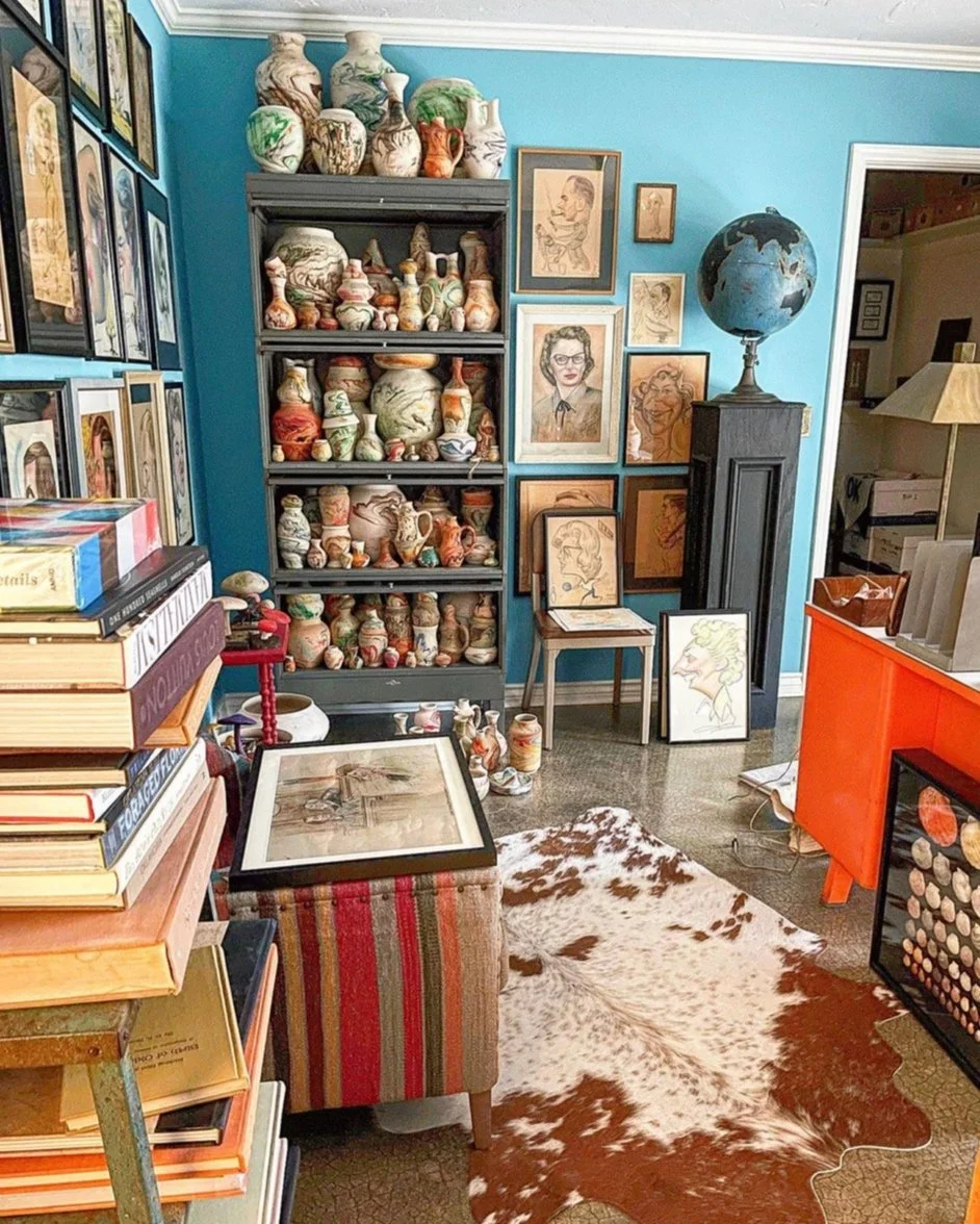 Human beings are motivated to collect objects for a variety of reasons: biological, psychological, cultural, financial, the list goes on as to what might push someone to collect. I can’t say I own any collections of my own except what has been handed down to me. But those who make room in their lives—be it time, energy, or space—to house their collections (of whatever size) are utterly fascinating. There have been several famous collectors through time ancient and modern. Of course there is Martha Stewart with her collections of McCoy pottery and jadeite glassware. But I’ve got someone else for you: Daniel Barrett Mathis (@notaminimalist on Instagram). His collections have been featured in several publications. I really admire his commitment to collecting, storing and displaying unique items in a visually appealing setting and very eclectic style. It’s just marvelous and is obviously the result of tons of dedication.